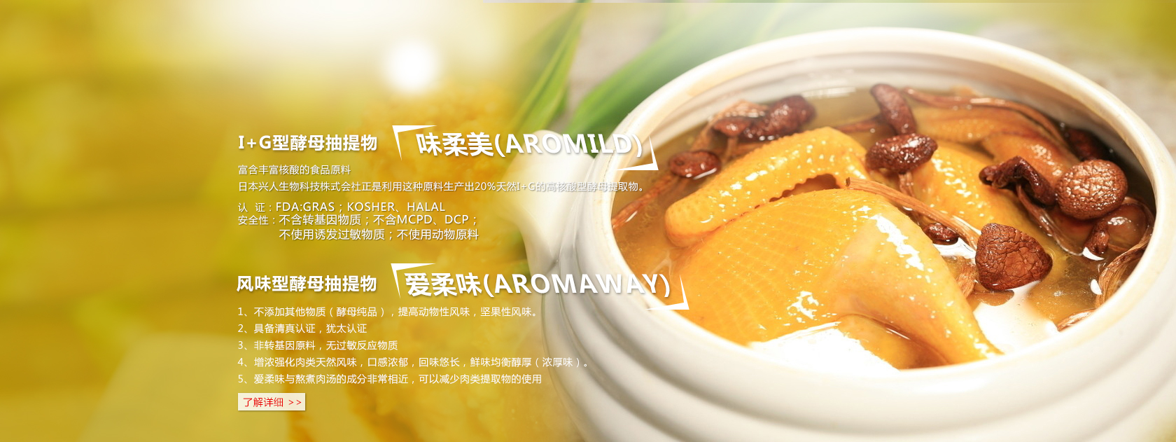 水解動植物蛋白系列(HVP&HAP) 復合調味料系列--酵母精、酵母抽提物 復合調味料系列--鮮味基礎調味料 復合調味料系列--海鮮風味 復合調味料系列--畜禽風味 復合調味料系列--和風調味料 復合調味料系列--口酷味 復合調味料系列--餐飲外食 味淋料酒 可得然凝膠G 面包預拌粉 面包改良劑